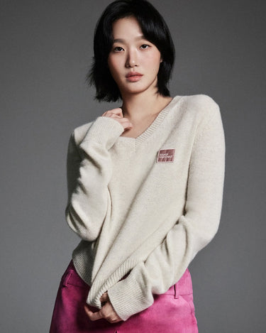 RACCOON BLENDED V NECK SQUARE LOGO_OATMEAL
