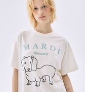 - Playful dachshund line-drawing graphic at the front